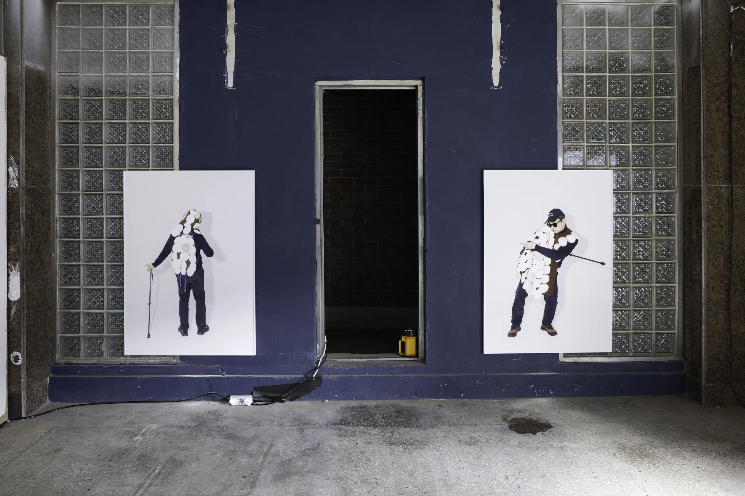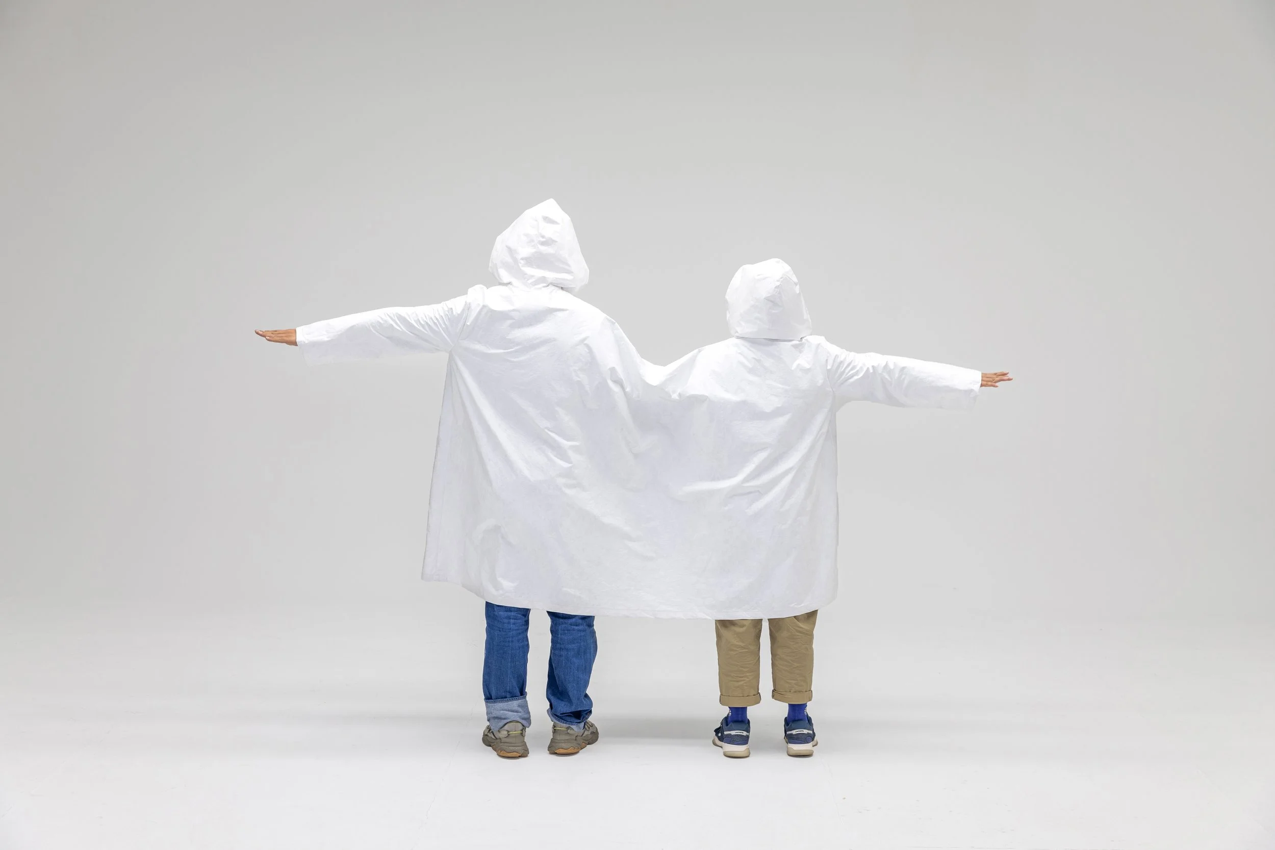 Know-how of Walking Again (2019–2025) is a project that produces wearable objects for walking in diverse environments, comprising Move by laumkon (2019), 1+1=1.5 (2023), and Night Signal (2025). Move by laumkon (2019), made from transparent PVC vinyl, inflates with air to become taut and expands to a height of around two meters. After observing the joints that move during walking, they divided the body into ankles, calves and thighs, forearms and arms, wrists, head, and torso, producing parts for each area, designed to be worn by wrapping around the respective body part and fastened with white snap buttons. 1+1=1.5 (2023), made with white Tyvek fabric and silver snaps, is a raincoat designed for two people to wear together. It allows the left hand of Q-rator, who uses a cane, and the right hand of Jee Song to move freely. At the same time, the right side of Q-rator’s body and the left side of Jee Song’s body can come into contact within the raincoat, providing support to prevent accidents on slippery, rain-soaked paths. Night Signal (2025) is a modular object worn in dark environments. The modules are made from retroreflective fabric that absorbs and reflects surrounding light and from molded cups normally used in women’s underwear. Absorbing and reflecting light at the points where they are attached, the Night Signal modules make the body visible in the dark; avoiding the cumbersome form of full‑body coverage, they adopt a modular format that can easily be attached anywhere. The circular modules can be attached to various places: The artists cut into the back panel of a backpack, removing its storage function and replace with modular attachments.These modules were also arranged as patterns on parts of a cape and hood that cover the upper body, creating a link between everyday clothing and functionality.